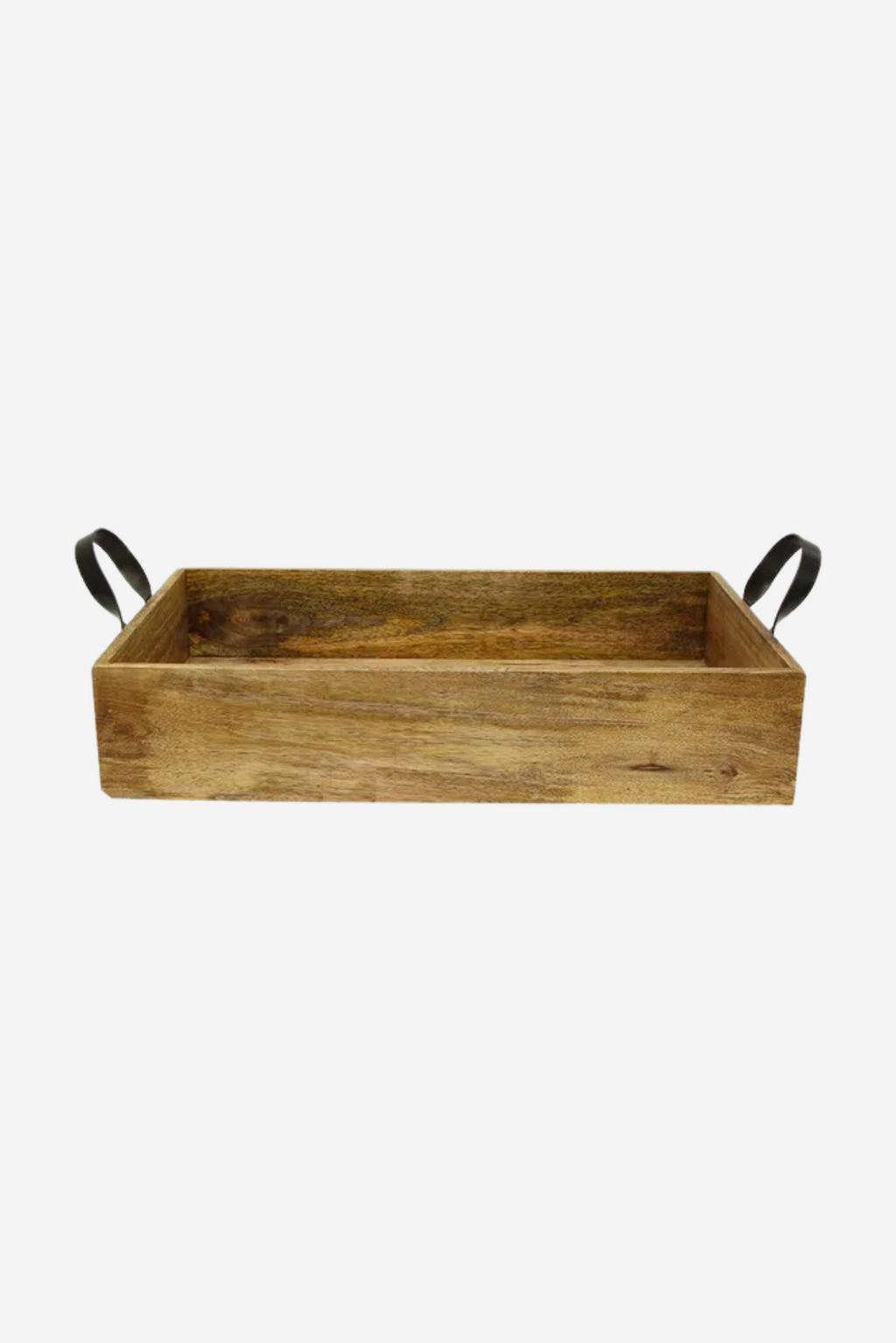This large wooden tray with high sides and rustic iron handles is perfect for use as a serving tray or as part of a diplay piece.