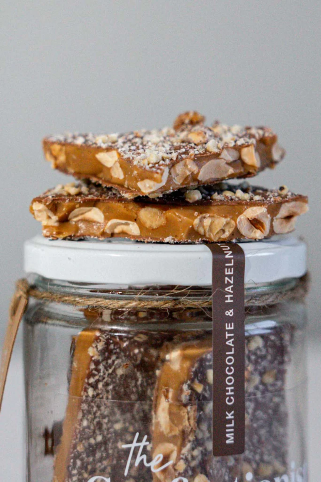 Handcrafted Hazelnut Toffee using roasted hazelnuts, covered in a generous layer of milk chocolate and sprinkled with crushed hazelnuts. Enjoy down to the last bite!
