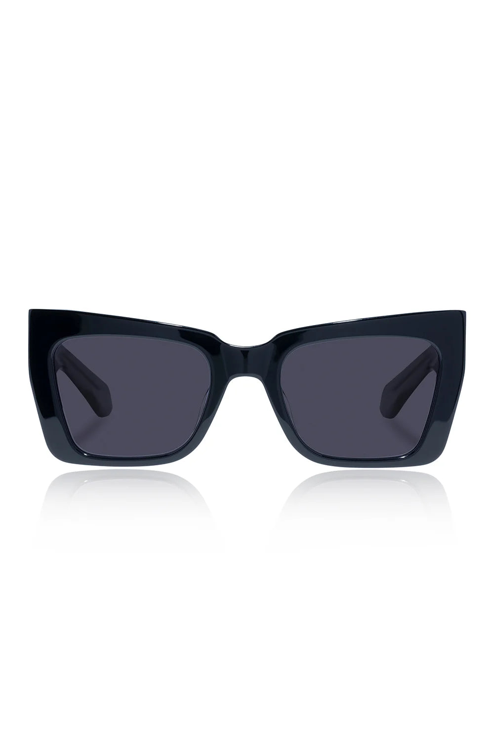 The Immortalised sunglasses in black feature a bold, squared-off cat-eye shape that commands attention. The glossy black bio-acetate frames are paired with smoke mono lenses, creating a sleek and versatile look. Finished with gold Karen Walker arrow hardware at the temples, these sunglasses embody unmistakable Karen Walker style.