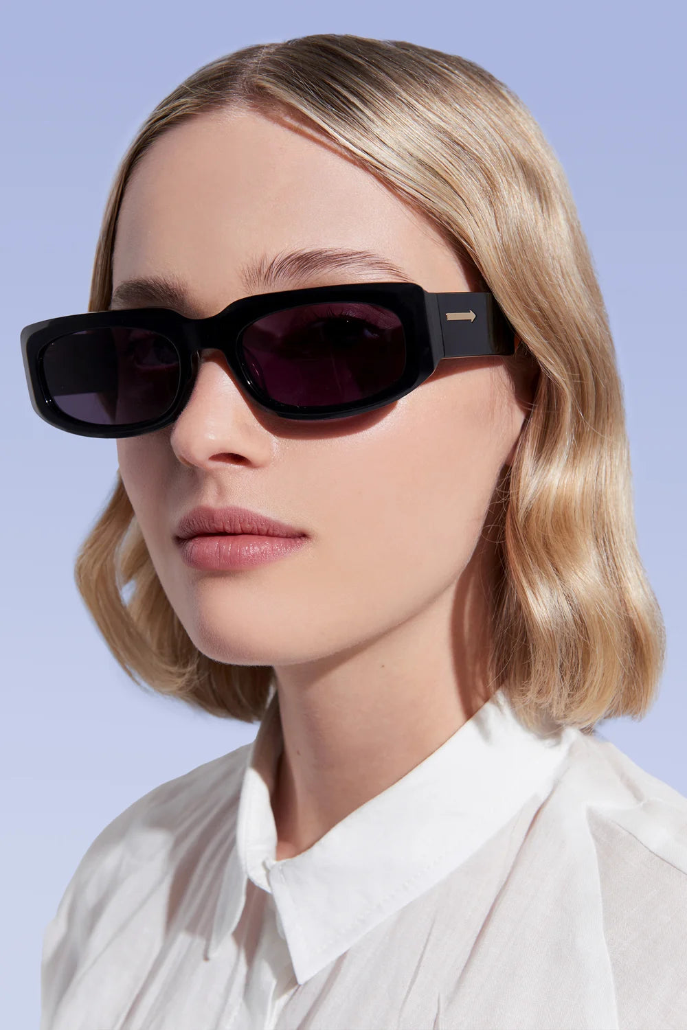 Embrace sleek sophistication with the Zahra sunglasses in black bio-acetate. The clean lines for its rectangular silhouette and tonal smoke mono lenses deliver a polished, modern look.