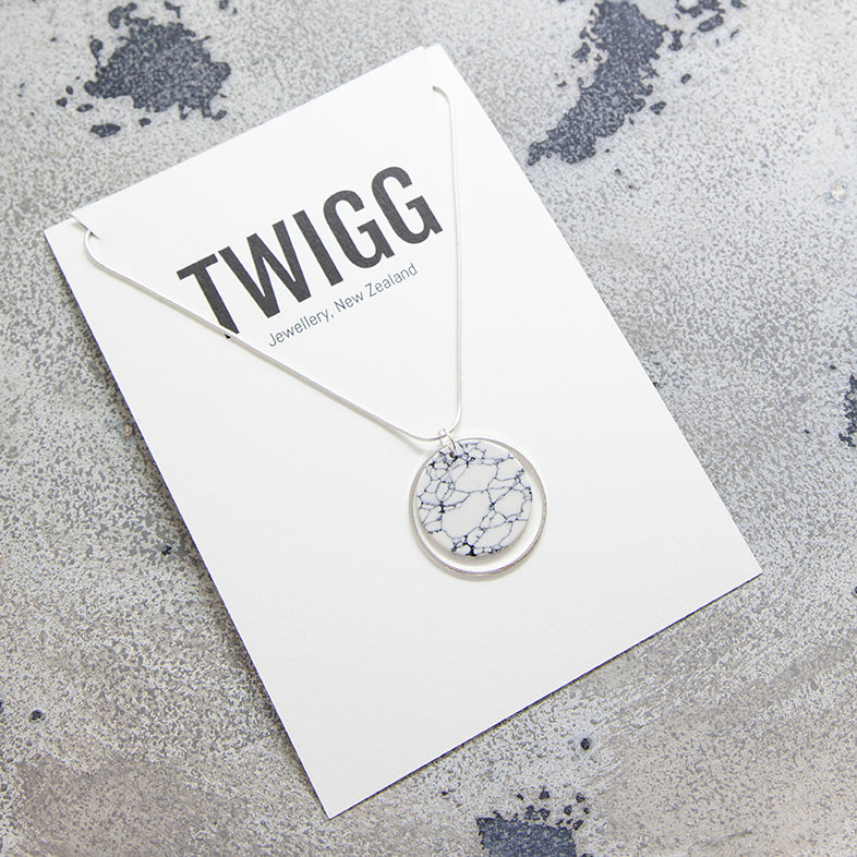 Marble disc and silver ring pendant, with 30 inch sterling silver snake chain.