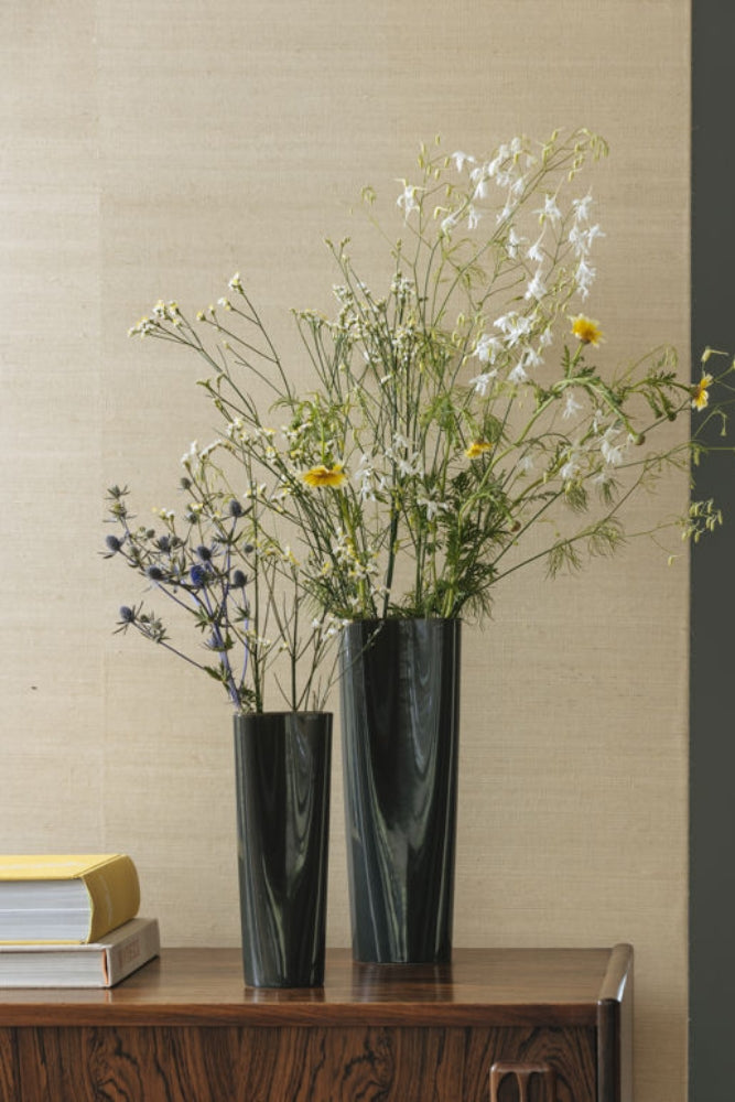 Its design features a cylindrical base that tapers into a ‘pinched’ top, forming a distinctive ‘figure eight’ silhouette with two separate chambers. Thoughtfully balanced proportions ensure the base circumference is equal to the pinched outline. The unique shape allows floral arrangements to fan out in a striking widescreen effect or form an asymmetrical display when one side is filled.