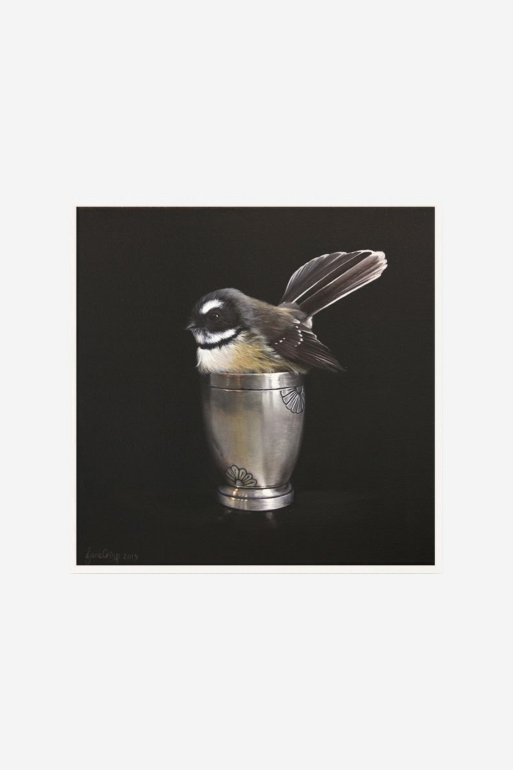 Amplifying the compassion and warmth of these heart-filled creatures, who live in the moment, she verges into portraiture. Placing Tui and Piwakawaka upon pedestals, she admires their wisdom and integrity through stories and legends which have been told. Crisp introduces objects of sentimental value to reflect their importance in an attempt to bring awareness of their fragile existence, an ongoing essence throughout her work.