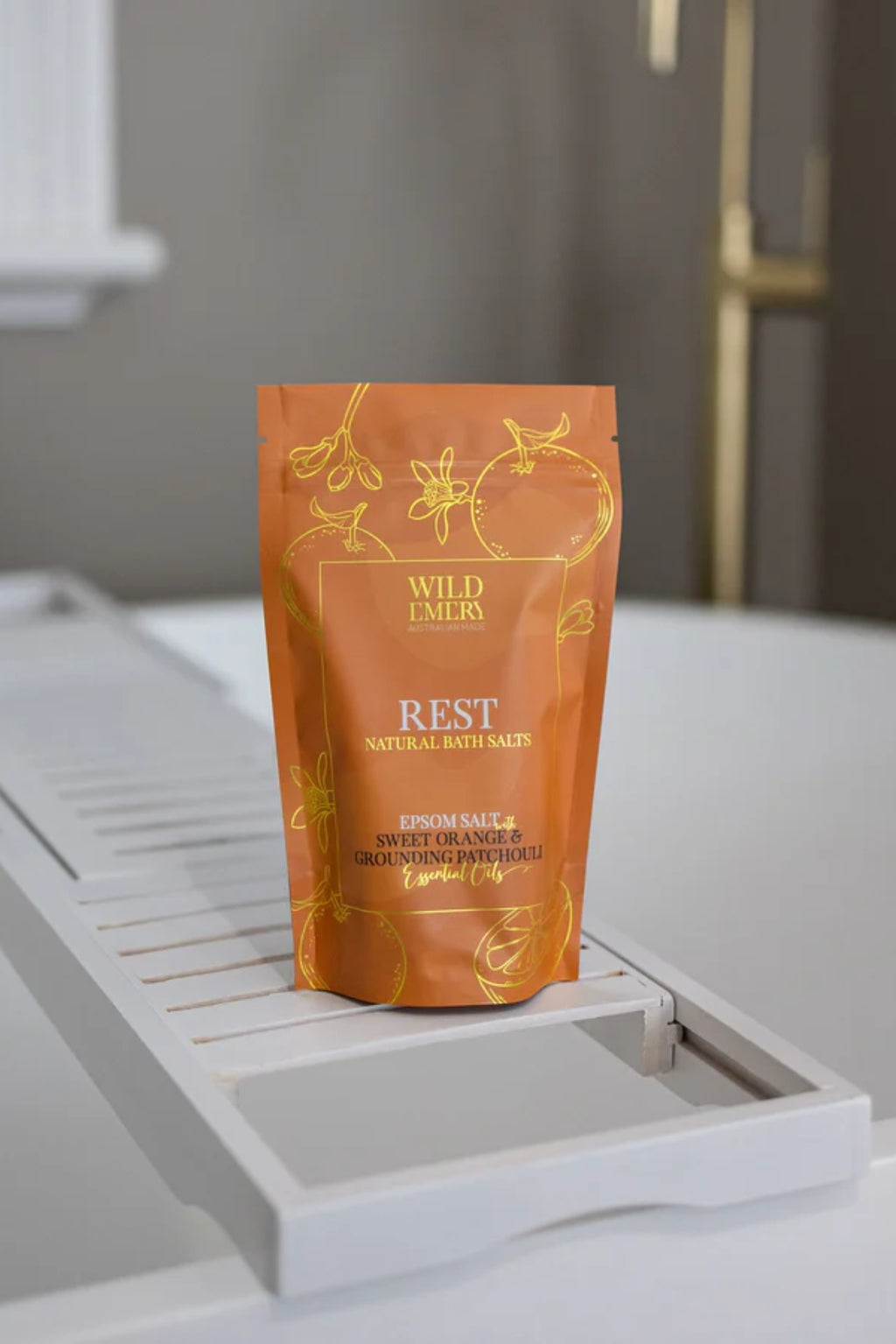 Australian made with natural pink Himalayan salt and mineral rich epsom salt for a deep rest inspired soak, infused with sweet orange and grounding patchouli essential oils.
