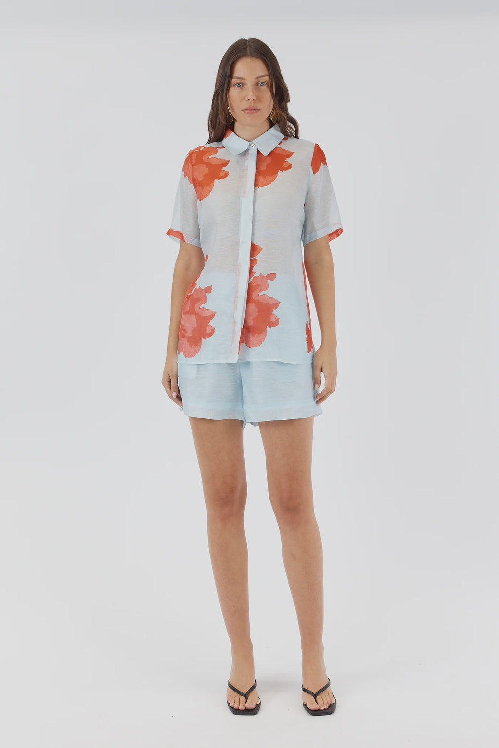 A short sleeve sheer shirt crafted from silk linen. It features a collared neckline, followed by a placket through centre front. Designed for a relaxed, oversized fit.