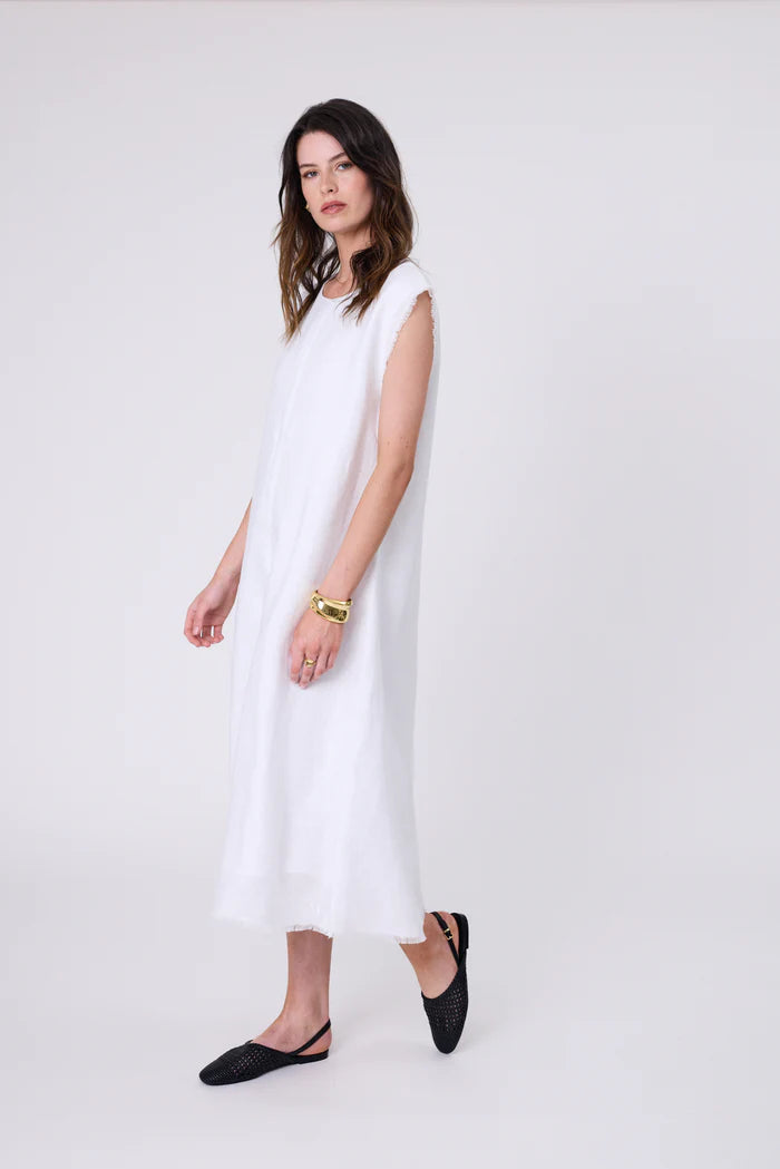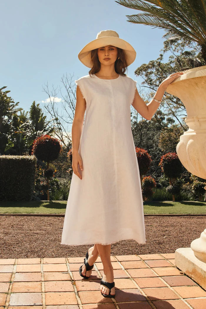 Chic and effortless, the Costa Linen Dress transitions seamlessly through all summer occasions. Crafted from refined European linen that offers beautiful drape and lasting quality, it falls in a flattering A-line silhouette and finished with frayed cap sleeves for an elevated edge. Featuring a centre front seam detail, keyhole button closure, and a softly frayed hem, this dress pairs perfectly with heeled sandals for an elevated look or slides for relaxed summer days.