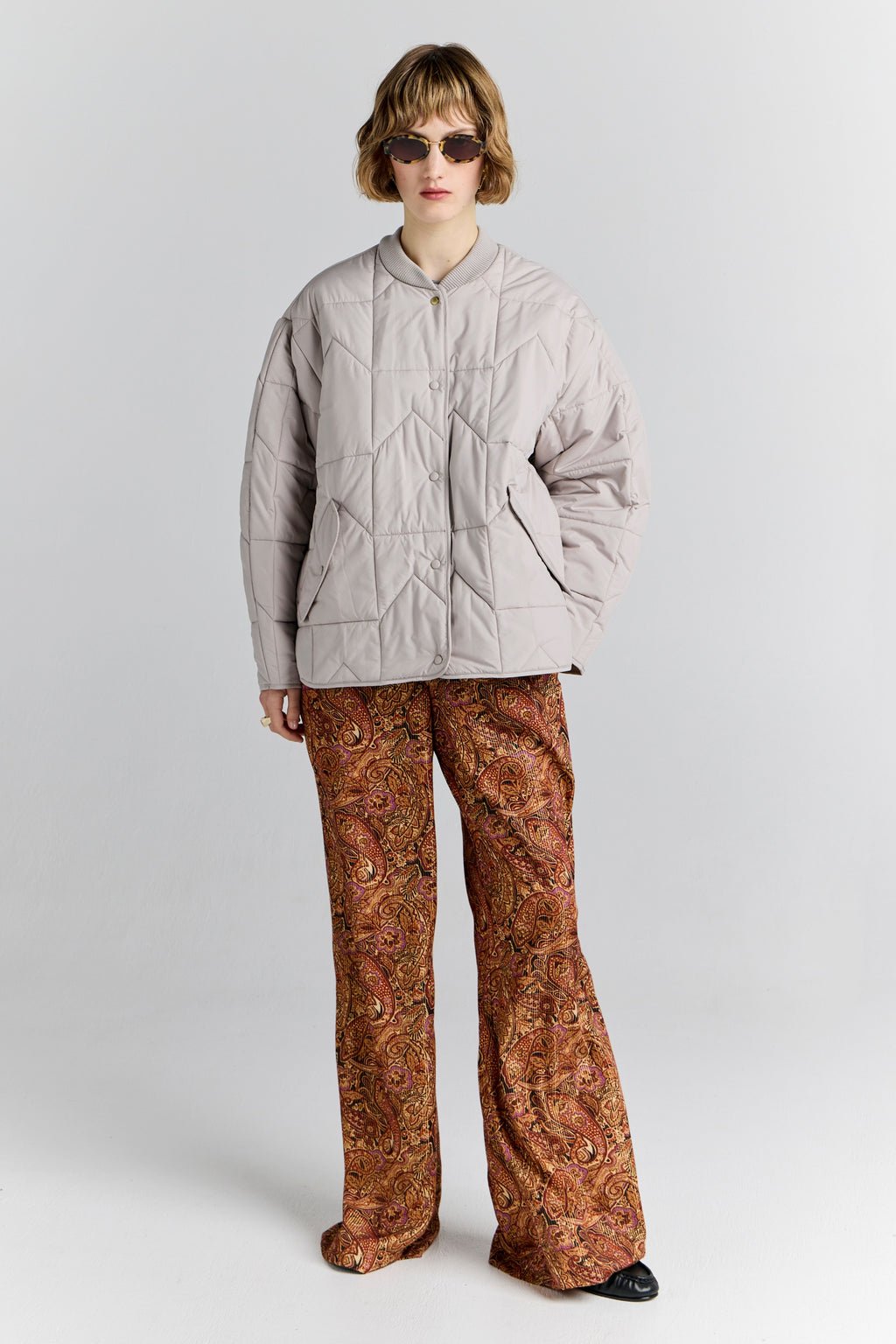 Quilted with the signature KW monogram pattern, the Quilted Monogram Jacket balances comfort with a refined, modern edge. Crafted from a lightweight layer with a vegan padded fill, it offers warmth without bulk – making it an easy layer across seasons. The relaxed silhouette is finished with a ribbed collar, snap-front closure, and contemporary curved hem with bound edges. Functional patch envelope pockets feature at the front, while the brown Runaway Girl stamp at the back completes the design with a subtle brand signature.