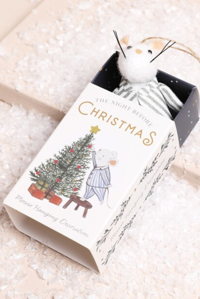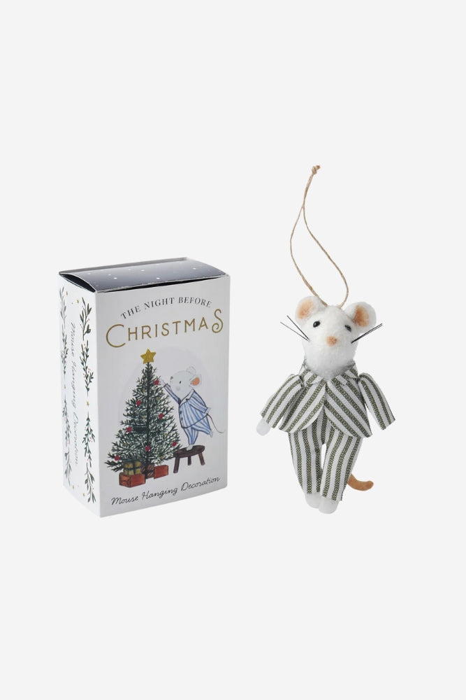 A white needle-felted mouse hanging decoration. Wearing sweet green and white striped pyjamas