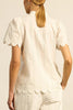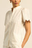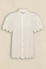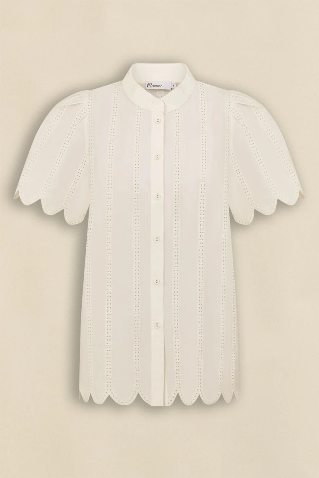 The pier top is elevated with cotton broderie that finishes in scalloped cuffs and a scalloped hem. a high neck-stand lends structure, while colour-matched fabric buttons elevated with classic shirt with a twist. designed for versatility, it pairs seamlessly with the harbour pant for an elegant seasonal look.