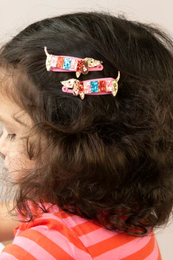 Add some unique style with this quirky set of hair clips, featuring two sweet sausage dogs.