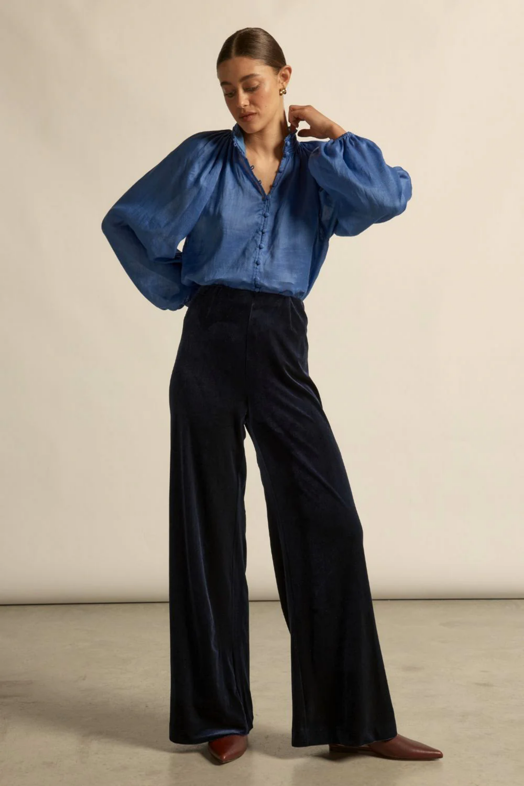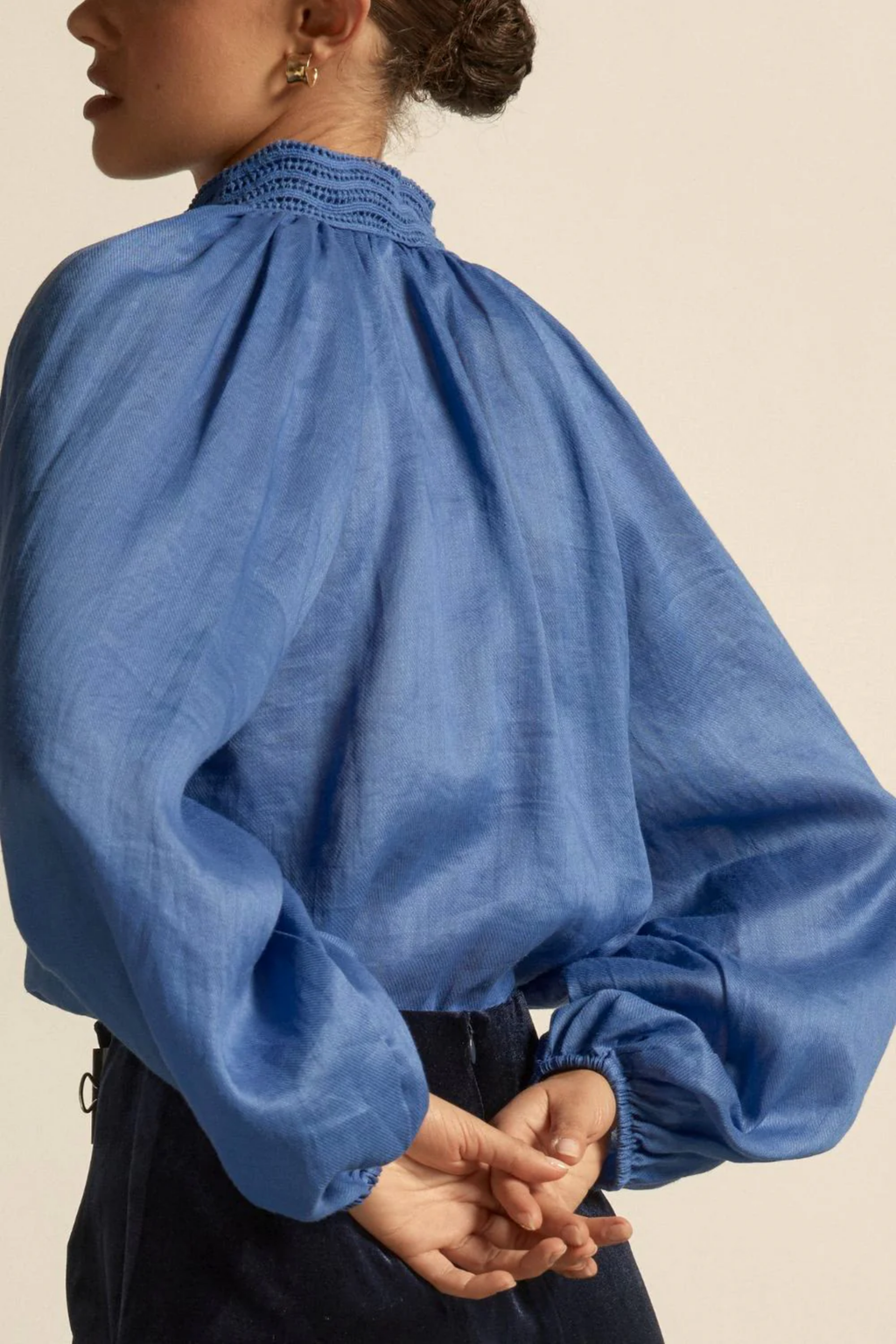 An elevated essential with feminine nuance. the sincere top refines a wardrobe staple through texture, proportion and thoughtful detail. A saturated blue with depth and clarity,